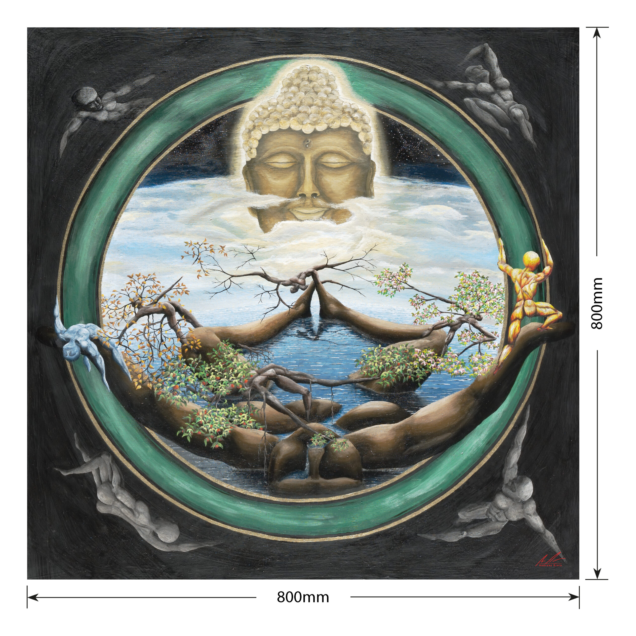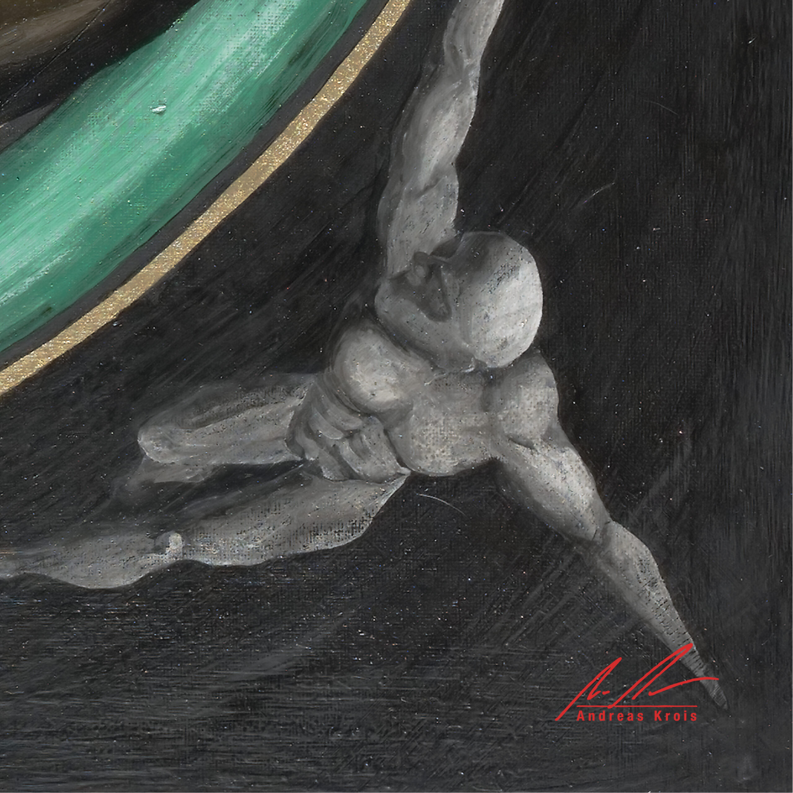 Im inneren Ring symbolisiert die Mutter Erde als tragendes Element, umgeben von Feuer, Wasser und Luft. Diese Elemente wirken in den Baumfiguren im „Kelch der Jahreszeiten“, durchströmt vom Atem des Göttlichen, der das Ring des Daseins nährt.
