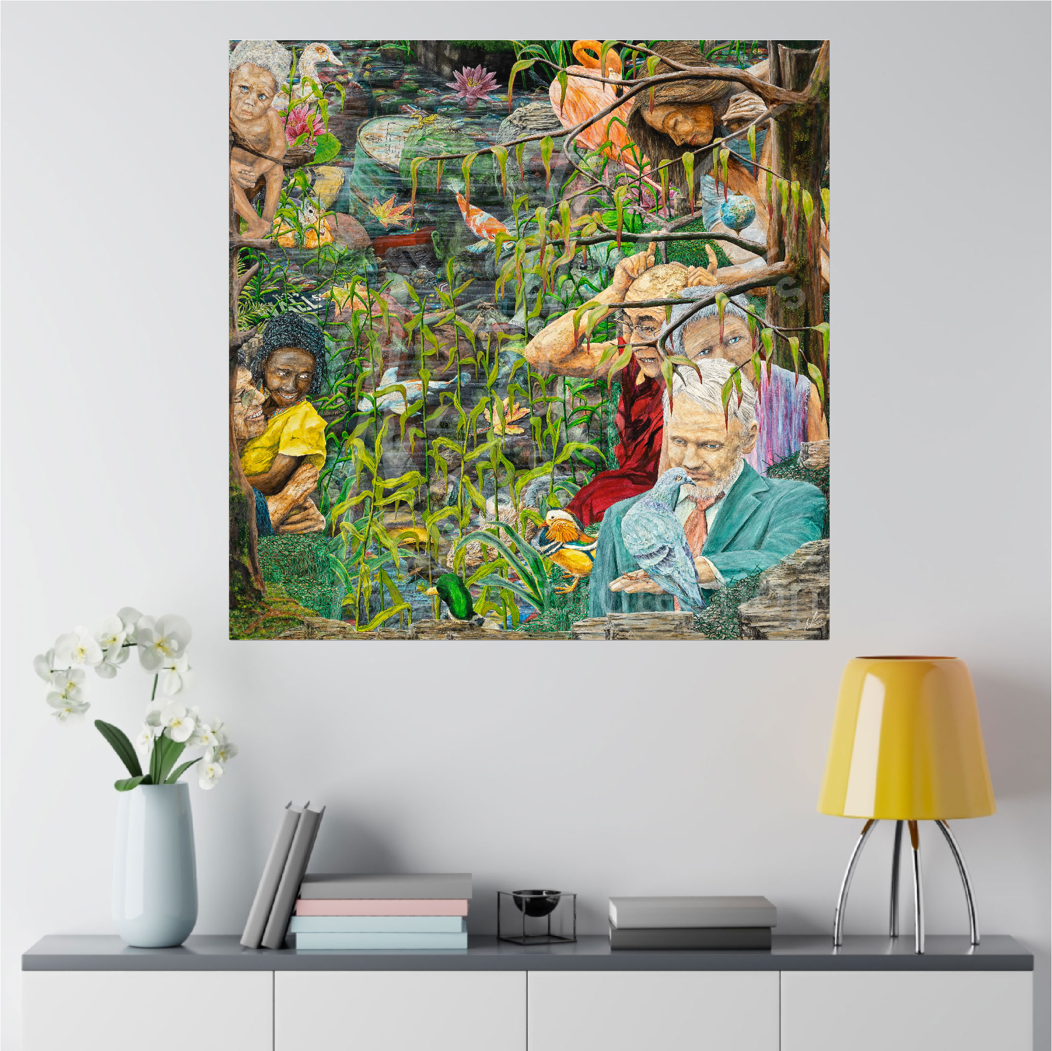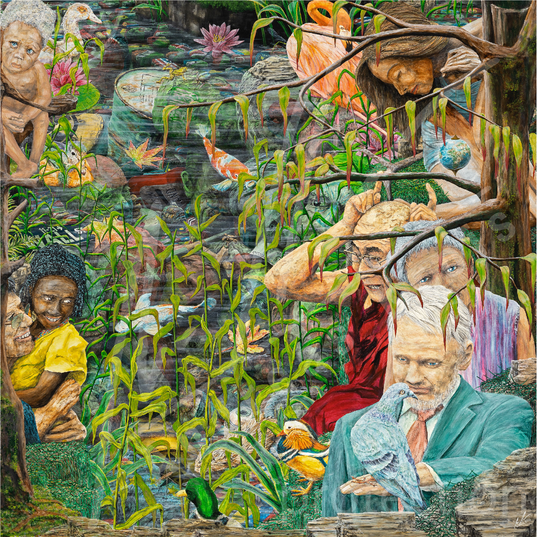 …im Wasser: Das Vergangene, die sich immer wiederholende Geschichte im wechselnden Kleid. (G20-Hamburg mit ihren Themen) die mit Landesflaggen bemalten Steinköpfe: Merkel, Trump usw., sowie alle Landesflaggen dieser Welt.