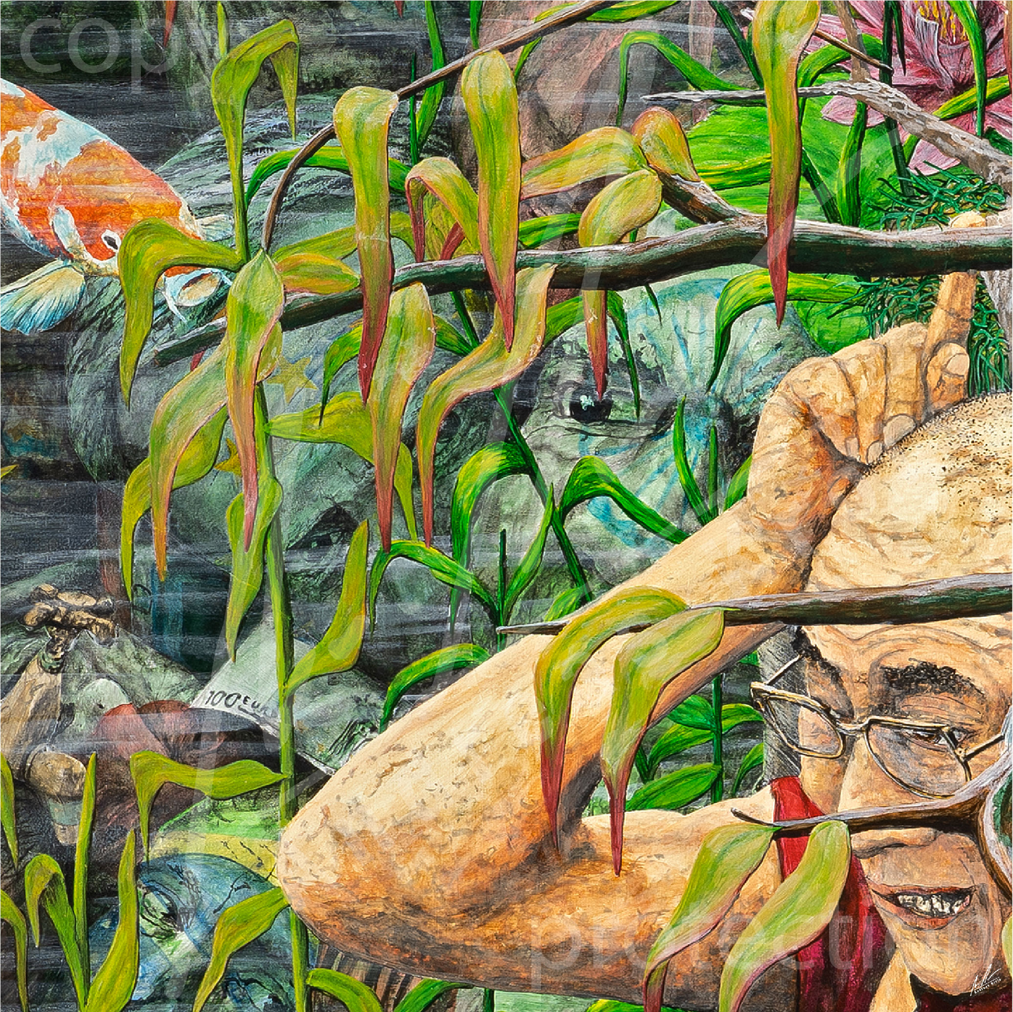 …im Wasser: Das Vergangene, die sich immer wiederholende Geschichte im wechselnden Kleid. (G20-Hamburg mit ihren Themen) die mit Landesflaggen bemalten Steinköpfe: Merkel, Trump usw., sowie alle Landesflaggen dieser Welt.