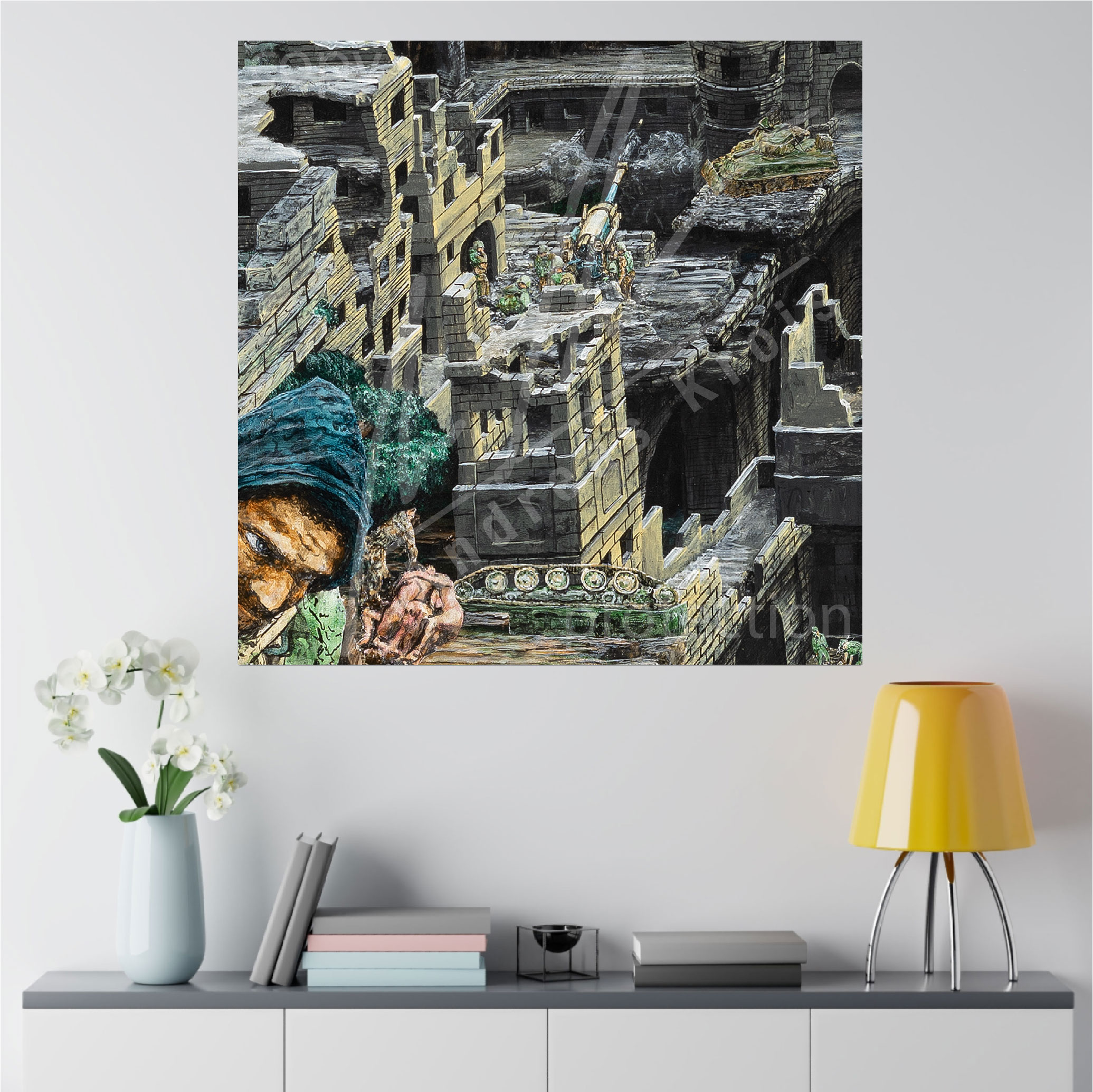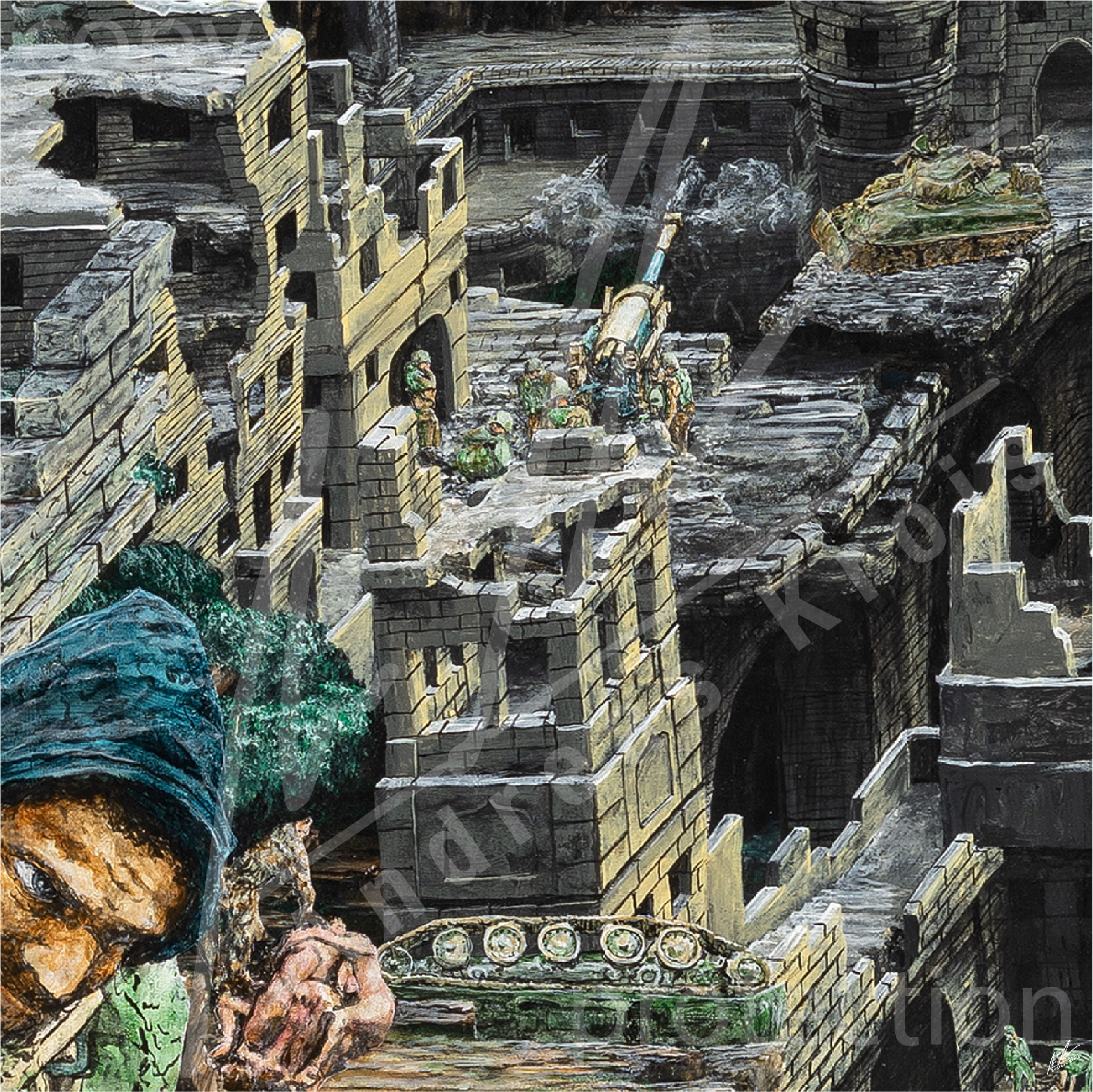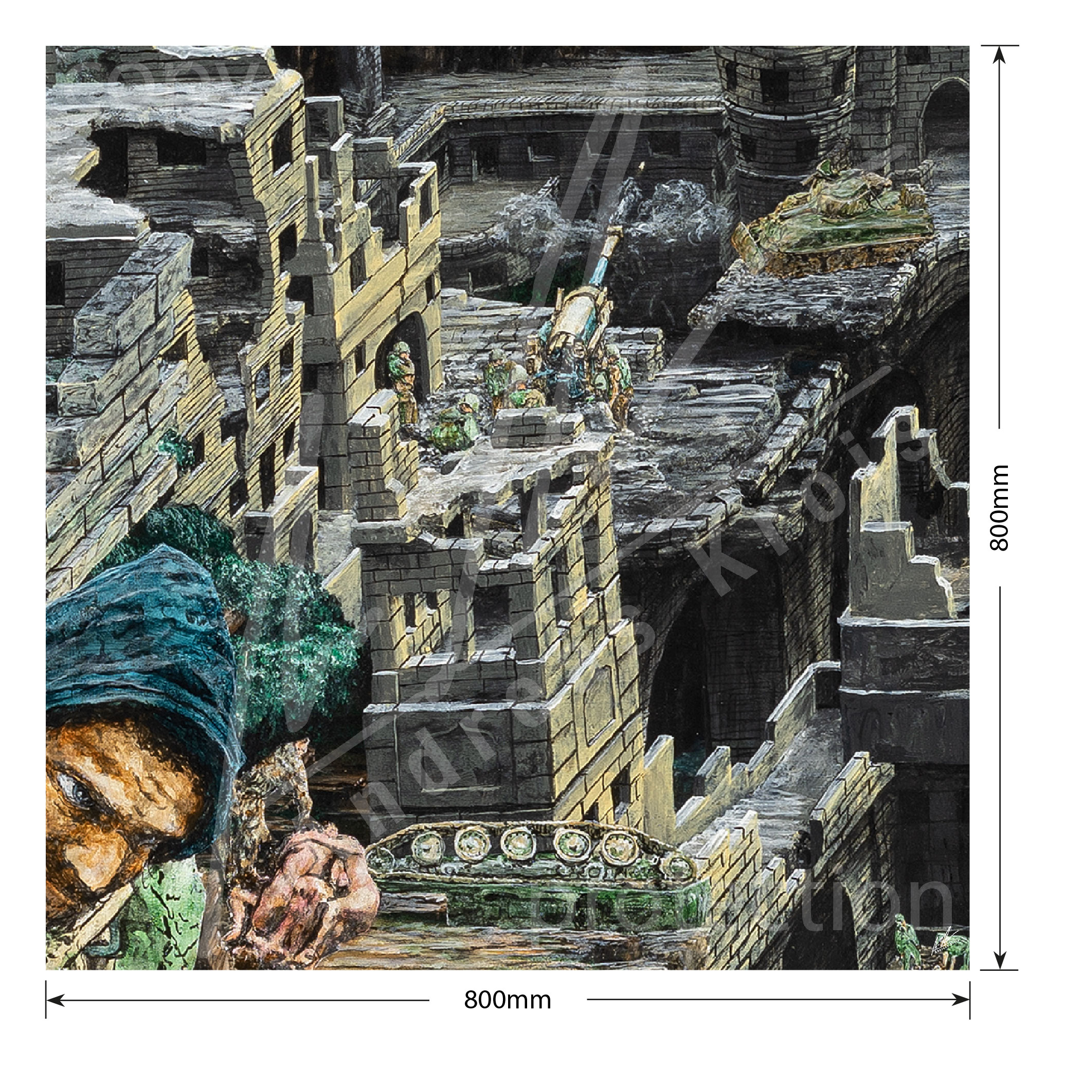 Links auf dem Bild ist eine Mauer mit Durchgang zu sehen, die zur Kriegswaffenversorgung dient, gestellt von den reichen an die ärmeren Länder, die einen hohen Preis dafür zahlen. Alles was zuvor verboten war, zählt nicht mehr. Menschenrechte, Wert und Würde sind verloren, stattdessen herrscht der Krieg mit seinem gnadenlosen Grauen. Tod, Folter, Vergewaltigungen, Elend, Angst, Missbrauch, Kindersoldaten. Im oberen Teil des Bildes ist ein kleiner Junge zu sehen. Derzeit noch mit einem Controller in der Hand, wird er uns bald eine der neuen Waffen zeigen. Aus dem Controller wird eine Fernbedienung, mit der er eine Drohne steuert, wahllos Menschen abknallt, wie im Computerspiel. Im unteren Teil des Bildes verleitet die zerstörte Stadt so viel Tiefe, dass es möglich ist visuell durch die Gassen und Schluchten zu wandern. In verbombte Häuser hinein, vorbei an einen Haufen lebloser Körper auf der Straße liegend oder Menschen mit dem Strick um den Hals hängend, den Freitod als letzte Chance sehend.