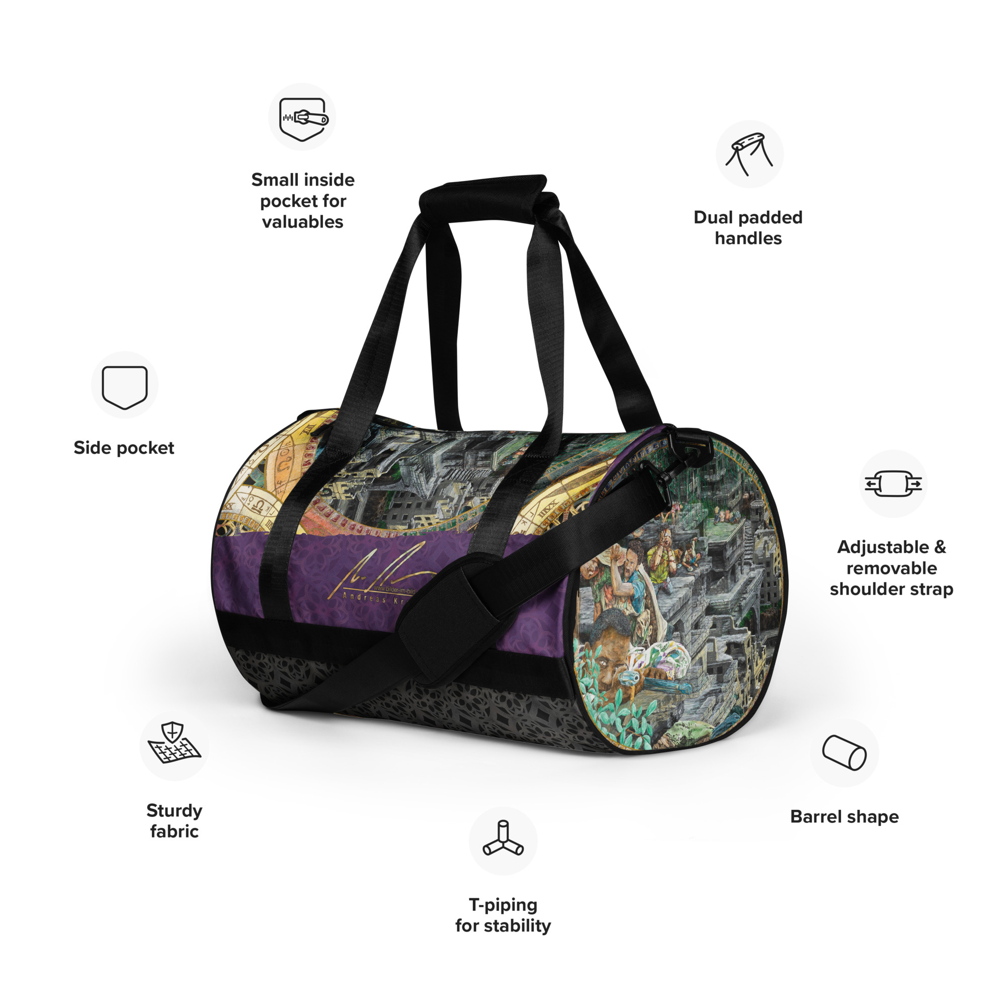 Bereit für Fitness? Verleihe deinem Training mit dieser vollflächig bedruckten Sporttasche neuen Schwung. Diese Tasche aus 100 % Polyester und robustem, wasserabweisendem Stoff vereint Spaß und Funktion. Und sie hat zusätzliche Taschen!