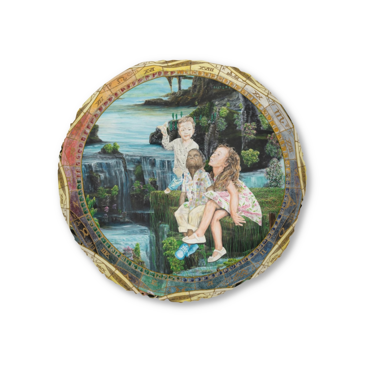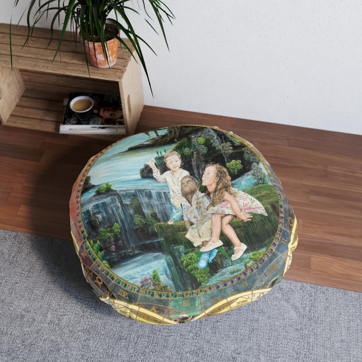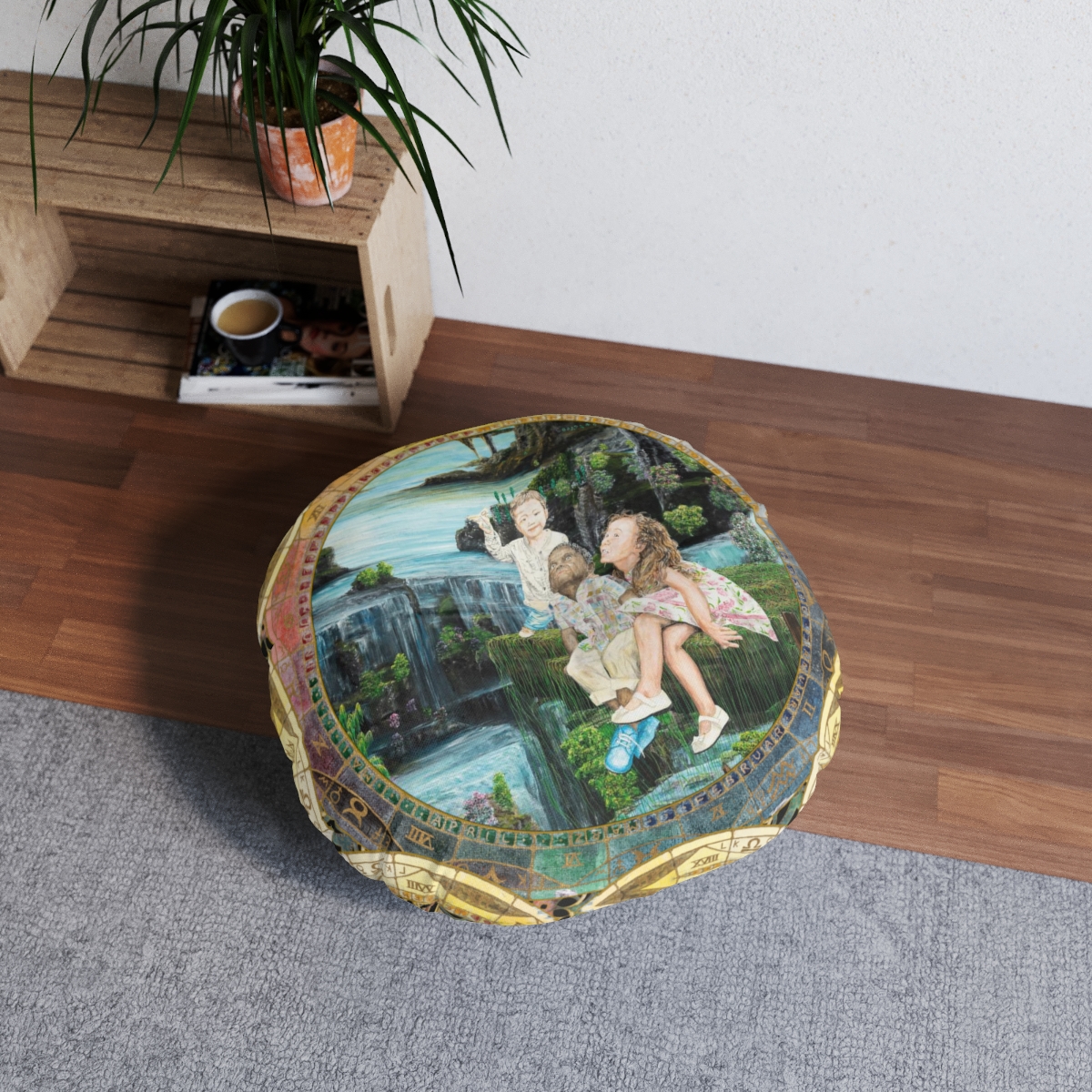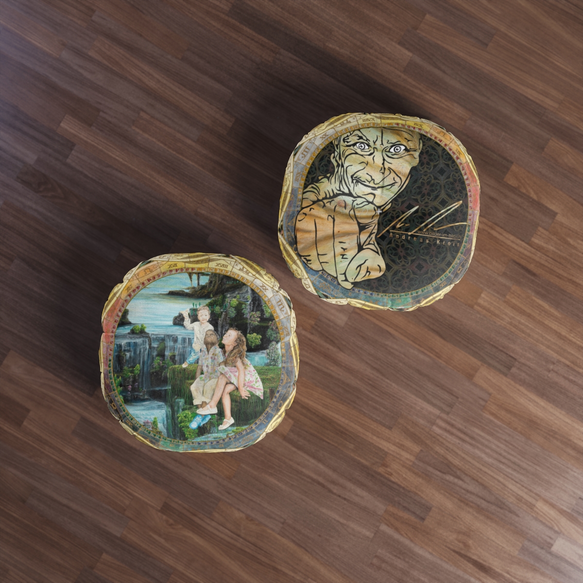 Verleihen Sie jedem Ruhebereich rund um das Haus eine individuelle Note mit einem runden, getufteten Bodenkissen mit einer weißen Naht in der Mitte. Dieses Bodenkissen wird mit seiner eigenen Füllung geliefert und ist ebenso bequem wie stilvoll.